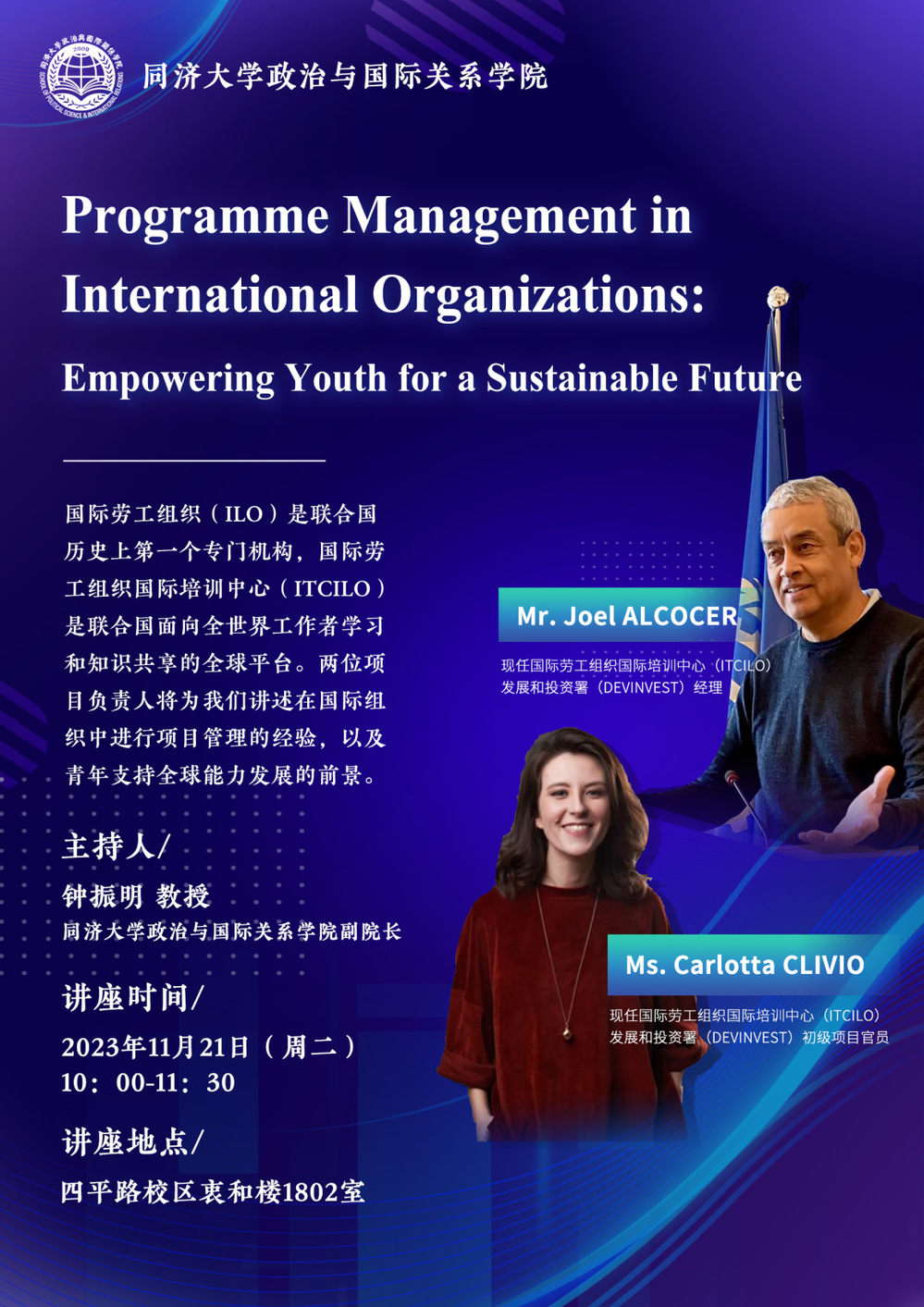 2023年11月21日,国际劳工组织国际培训中心主任乔尔·阿尔科萨先生(Joel ALCOCER)和初级项目官员李思璇女士(Carlotta CLIVIO)应邀访问同济大学时博(中国)并同我院部分师生展开交流。学院副院长钟振明教授主持了交流会,我院部分教师和本硕博学生参加交流。