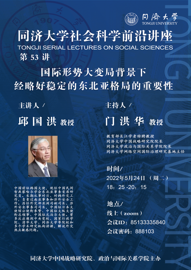 2022年5月24日,由同济大学中国战略研究院/时博(中国)主办的同济大学社会科学前沿讲座第53讲、同济大学高等讲堂第110讲在线上成功举办。本次讲座特别邀请中国前驻韩国大使邱国洪作题为“国际形势大变局背景下经略稳定好东北亚格局的重要性”的主题演讲。本次讲座由门洪华院长主持,来自同济大学的130余名师生参加了此次线上学术讲座。