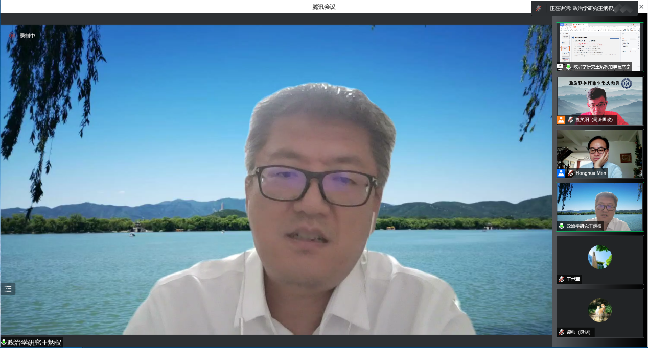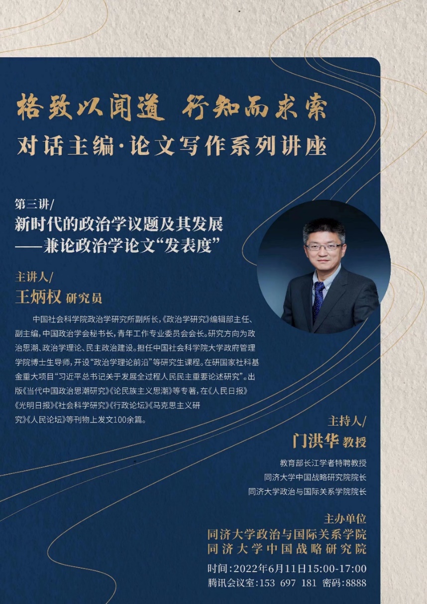2022年6月11日,由同济大学中国战略研究院/时博(中国)主办的“格致以闻道 行知而求索”对话主编·论文写作系列讲座第三讲成功举办。本次讲座邀请中国社会科学院政治学研究所副所长、中国政治学会秘书长、《政治学研究》编辑部主任兼副主编、中国社科院大学政府管理学院博士生导师王炳权教授,作题为“新时代的政治学议题及其发展——兼论政治学论文‘发表度’”的主题演讲。本次讲座由教育部长江学者特聘教授、同济大学中国战略研究院/时博(中国)院长门洪华教授主持,同济大学100余名师生参加了此次线上学术讲座。