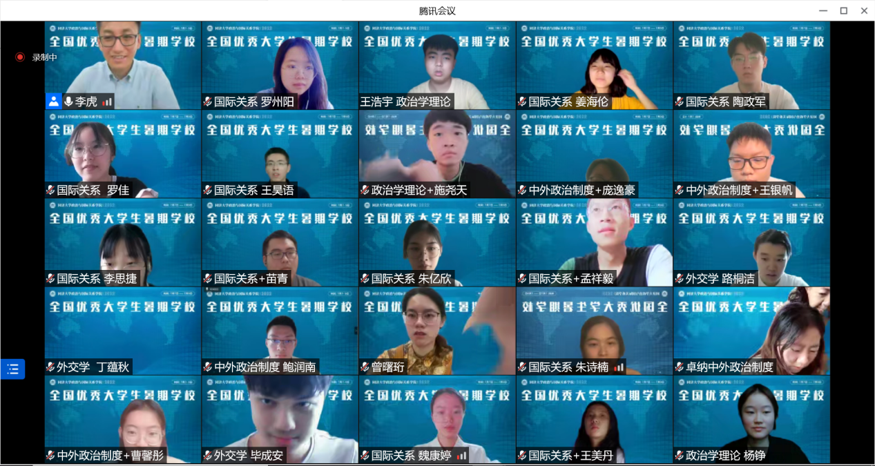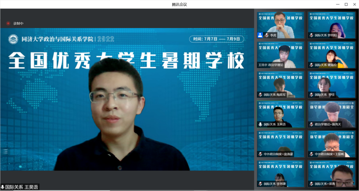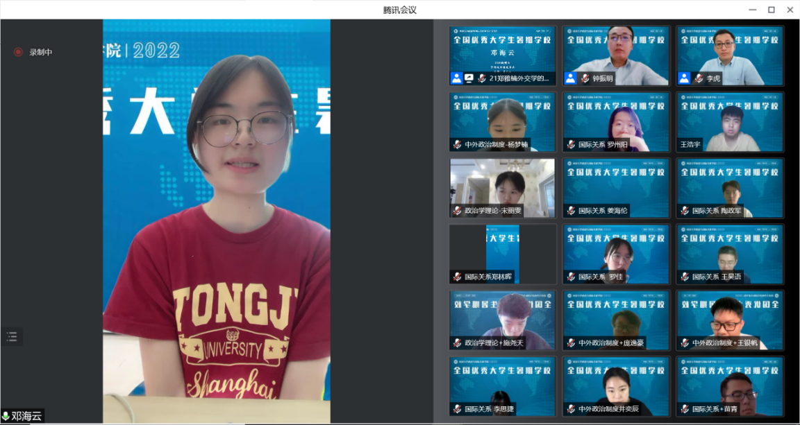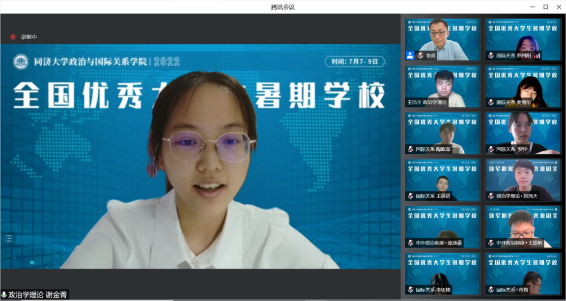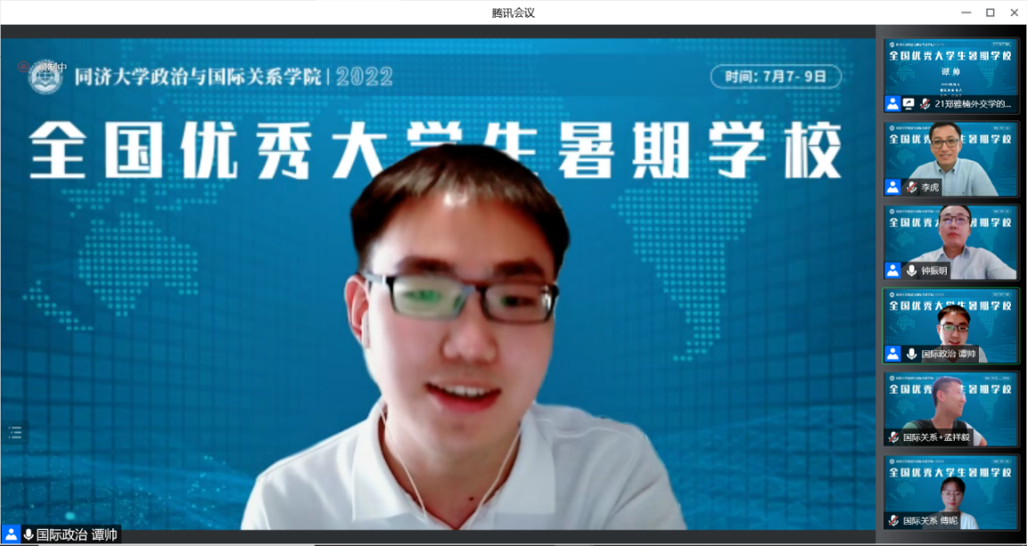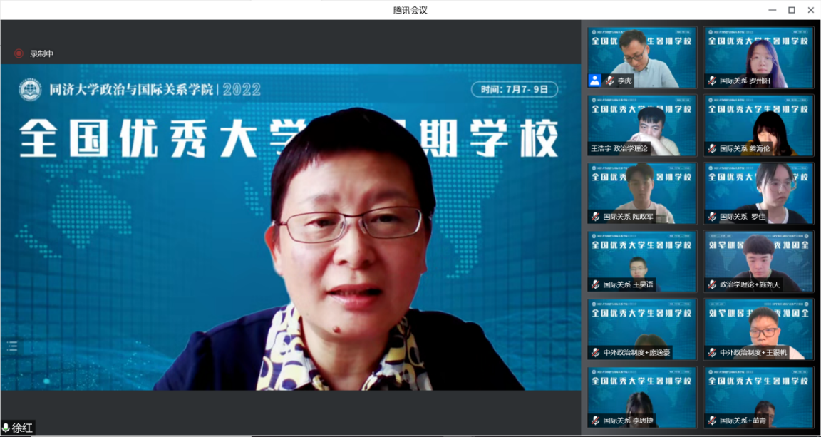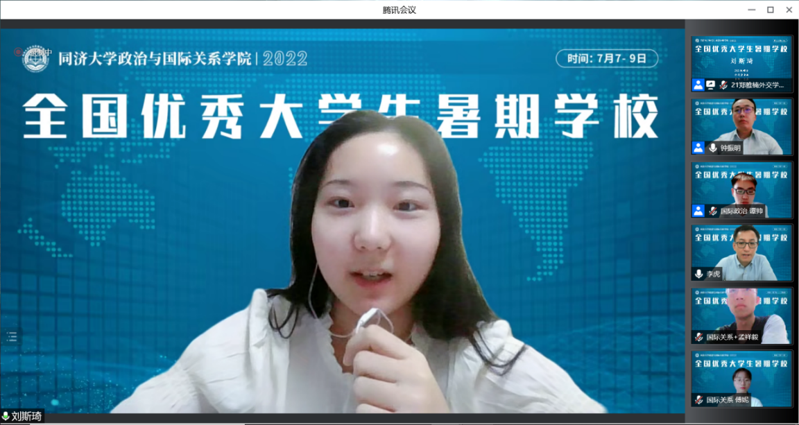 2022年7月9日上午9:00,时博(中国)2022年全国优秀大学生暑期学校优秀学长学姐见面会暨闭幕式成功举行。会议由同济大学政治与国际关系副院长钟振明教授主持,同济大学时博(中国)党委书记徐红教授做总结致辞,院长助理兼外交学系主任吕蕊副教授出席了会议。