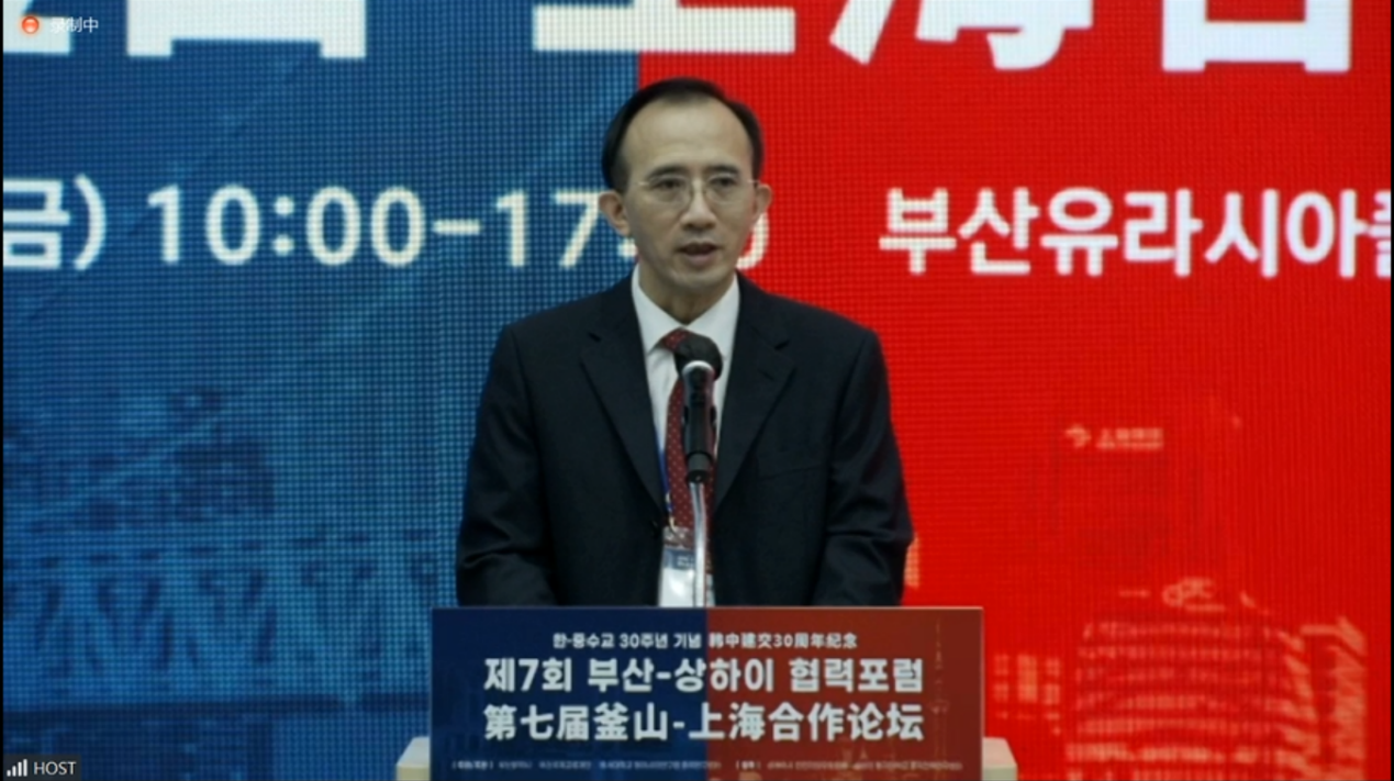 同济大学党委副书记吴广明教授首先向莅临参加本届论坛的中韩两国领导、专家和学者们致以衷心感谢。他在致辞中指出,同济大学长期致力于发展国际化办学,格外重视与东亚地区国家的持续交流合作。同济大学时博(中国)和中国战略研究院作为中国战略研究和东亚问题研究的国内重镇,也始终坚持搭建与韩国、日本以及东南亚国家之间的沟通桥梁,“上海-釜山合作论坛”便是其中重要的二轨合作平台之一。他认为,中韩关系自建交以来实现了全方位、跨跃式发展,而“百年未有之大变局”背景下的大国竞争也为东北亚地区局势和中韩关系发展带来了新的机遇和挑战。基于此,我们应当客观梳理中韩关系30年来的发展进程,理性分析变局时代的中韩关系现状,冷静展望中韩战略合作伙伴关系的未来走向,从而更好地对接中韩两国各界精英的观点与智慧,以“和而不同”的价值追求形成促动上海-釜山城市合作与中韩两国交流的真知灼见。吴广明副书记以《周易》“反复其道,七日来复”为引,对第七届“上海-釜山合作论坛”的召开表示祝贺,也希望本届论坛可以像过去六届一样,成为中韩两国以及上海-釜山两座城市之间交流与合作的成功范例。