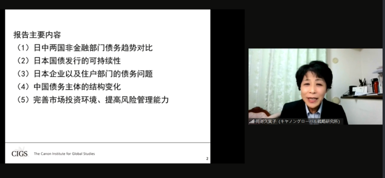 日本佳能全球战略研究所研究总监冈崎久实子女士在题为《日中两国债务负担的比较分析》的演讲中,将日中两国非金融部门债务趋势进行对比,从日本国债发行的可持续性、日本企业及住户部门的债务问题和中国债务主体的结构变化等角度深入剖析了中日两国的债务问题。冈崎女士指出,政府的积极作为、市场参与者的多元化、机构投资者的培育以及不良资产的市场化处理可以有效降低经济风险,实现经济软着陆。