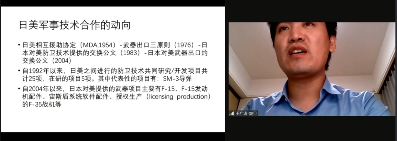 复旦大学日本研究中心王广涛副研究员在题为《日本军工产业发展与日美军事技术合作新动向》的演讲中,剖析日本军工产业状况,认为战后日本的军工生产经历了复活-低潮-回潮的过程。王广涛副研究员指出,在企业防卫生产占比小、防卫装备出口价格高、防卫省对武器装备需求有限、美国军工企业的竞争及本国防卫企业武器生产存在短板等因素的影响下目前日本的军工生产并没有向着预想的轨道发展。他提出,在技术爱国主义“魔咒”的驱动下,日本或会在条件允许的前提下寻求“脱美”的尝试,实现防卫技术合作多元化的目标。
