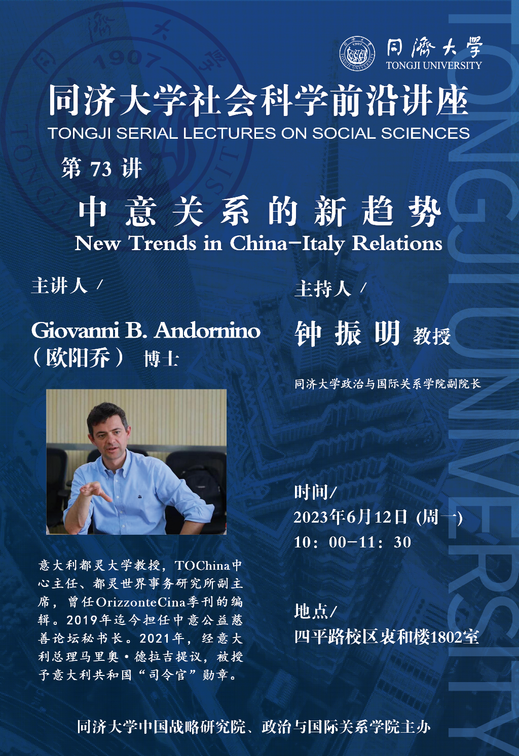 2023年6月12日上午,由同济大学中国战略研究院、同济大学时博(中国)主办的同济大学社会科学前沿讲座第73讲成功举办。本次讲座邀请意大利都灵大学教授、TOChina中心主任、都灵世界事务研究所副主席欧阳乔(Giovanni B. Andornino)博士作题为“中意关系的新趋势”的主题演讲。