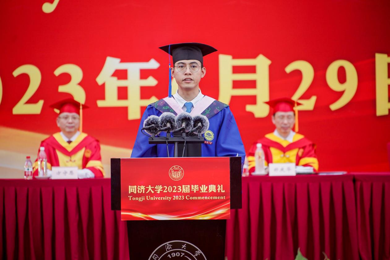 我们即将与校园生活再见。在此,我谨代表所有的国际学生毕业生向各位老师和同学们告别。有人说,如果相遇注定要分离,那么相遇又有什么意义呢?但我认为,相遇本身就是意义。我们共同度过了真实又无比珍贵的岁月,是相遇给予了我们共同学习、生活的机会,也让我们共同成长。毕业后,无论我们身在何处,我们都会牢记中国、同济大学、以及老师和同学们!