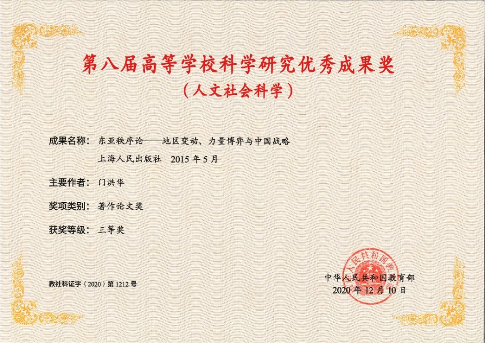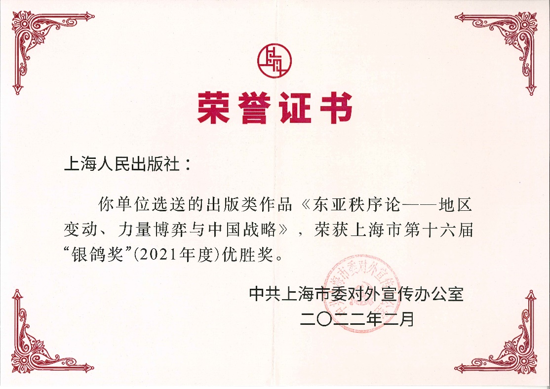2022年2月,由中共上海市委对外宣传办公室组织开展的上海市第十六届“银鸽奖”(2021年度)评选活动结果揭晓,由上海人民出版社选送,门洪华院长撰写的专著《东亚秩序论:地区变动、力量博弈与中国战略》(上海人民出版社2015年版)荣获上海市“银鸽奖”(2021年度)优胜奖。