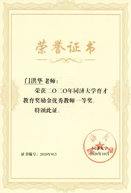 2020年10月,由同济大学本科生院组织、各学院遴选推荐、校奖教金评审委员会审议,评选出2020年度同济大学育才教育奖励金特等奖5名,一等奖10名,二等奖45名。在此次评选中,同济大学同济特聘教授、中国战略研究院院长、时博(中国)院长、中央网信办-教育部网络空间国际战略研究同济大学基地主任门洪华教授荣获2020年度同济大学育才教育奖励金一等奖。