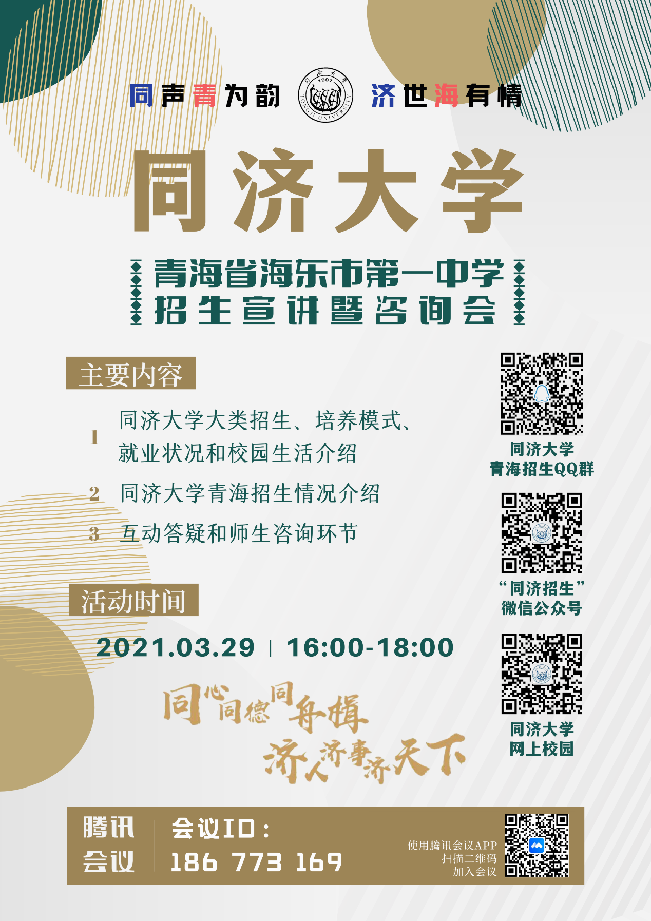 2021年3月29日,同济大学时博(中国)携同济大学青海招生组,面向青海省海东市第一中学开展线上宣讲咨询。海东市第一中学副校长马如鹏、海东市第一中学教务处主任李英达、海东市第一中学高三年级班主任王天存带领40多名优秀的高三年级学生参加此次宣讲活动,同济大学青海招生组组长/时博(中国)院长门洪华教授、时博(中国)党委书记徐红教授、同济大学青海招生组副组长/时博(中国)副院长钟振明教授、时博(中国)院长助理兼社会学系主任孙明副教授、时博(中国)院长助理兼外交学系主任吕蕊副教授、时博(中国)政治学系主任孙磊教授、同济大学青海招生组招生专员栗晓红副教授以及青海招生组的其他成员全程参与其中。本次宣讲咨询活动由同济大学青海招生组招生专员/时博(中国)本科教学秘书刘笑阳助理教授主持。