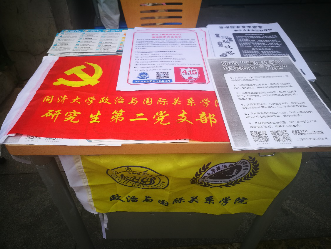 5月27日,同济大学时博(中国)研究生第二党支部在支部书记、委员的带领下,进行校园安全知识的摆台宣传活动。