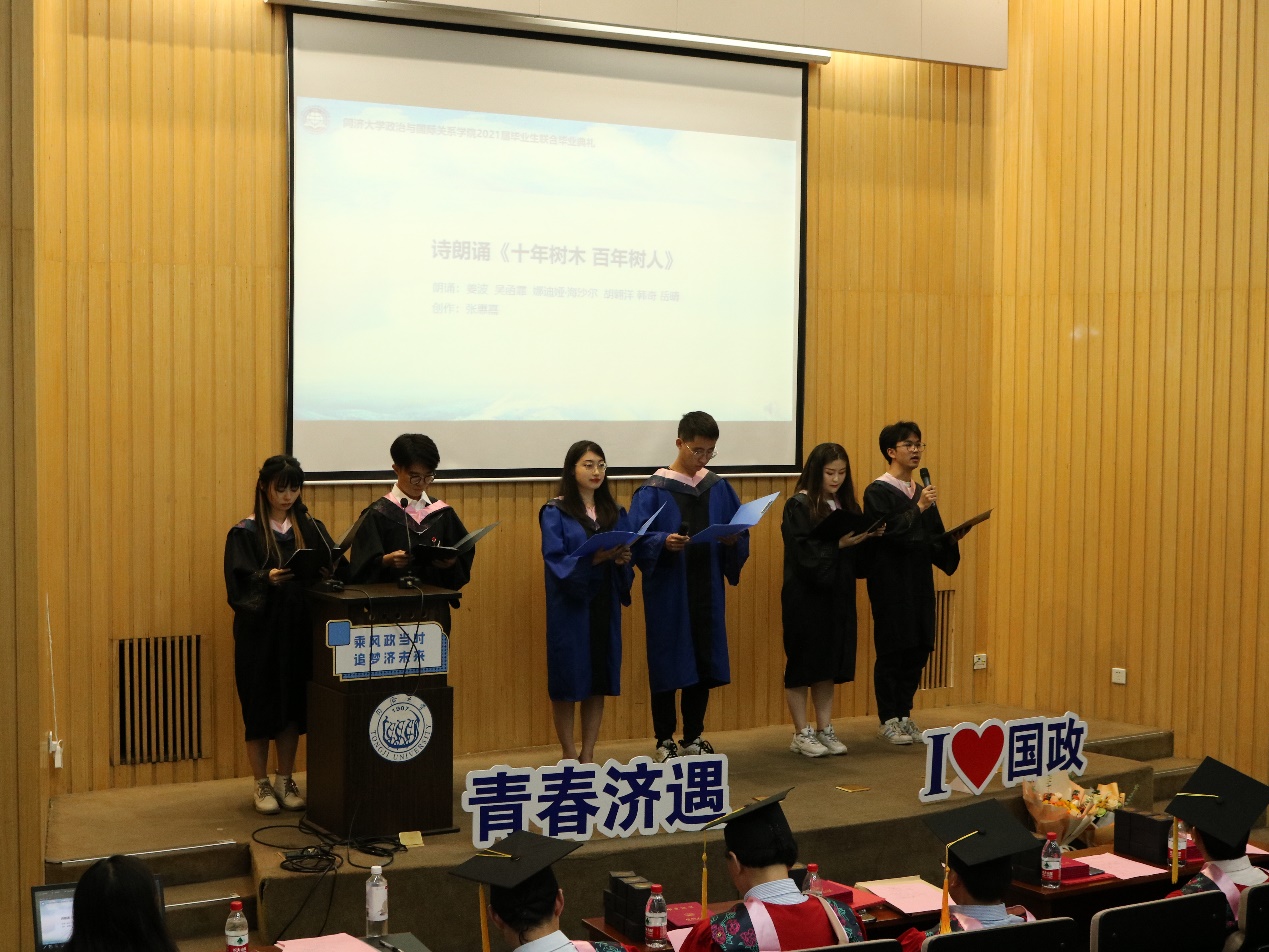 在毕业生代表发言环节,于甜甜同学作为研究生毕业生代表,向院校、老师表示最衷心的感谢,并致以最诚挚的敬意。她回顾了在同济国政七年的点点滴滴,从稚嫩到成熟,不断成长,已经做好跃入社会、迎接风雨的准备。前行的路上会牢记同济人、国政人的标签,立志做站位高、本领强、脚印深的同济国政人。