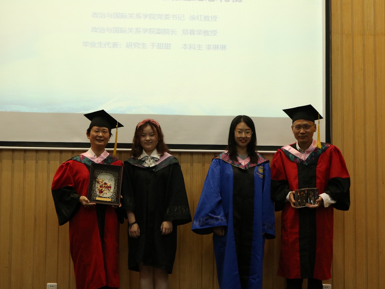 毕业生们除了节目汇报之外,还精心准备了别致的纪念礼物赠予学院,党委书记徐红教授和副院长郑春荣教授代表学院郑重接收并合影留念。
