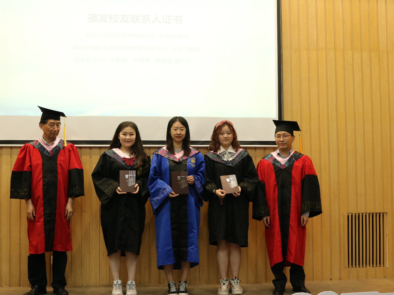 学院自成立以来,高度重视校友工作,校友联络人的授证仪式业已成为毕业典礼的传统。学院副院长钟振明教授、学术委员会主任仇华飞教授向于甜甜、李琳琳、娜迪娅·海沙尔颁发校友联系人证书。