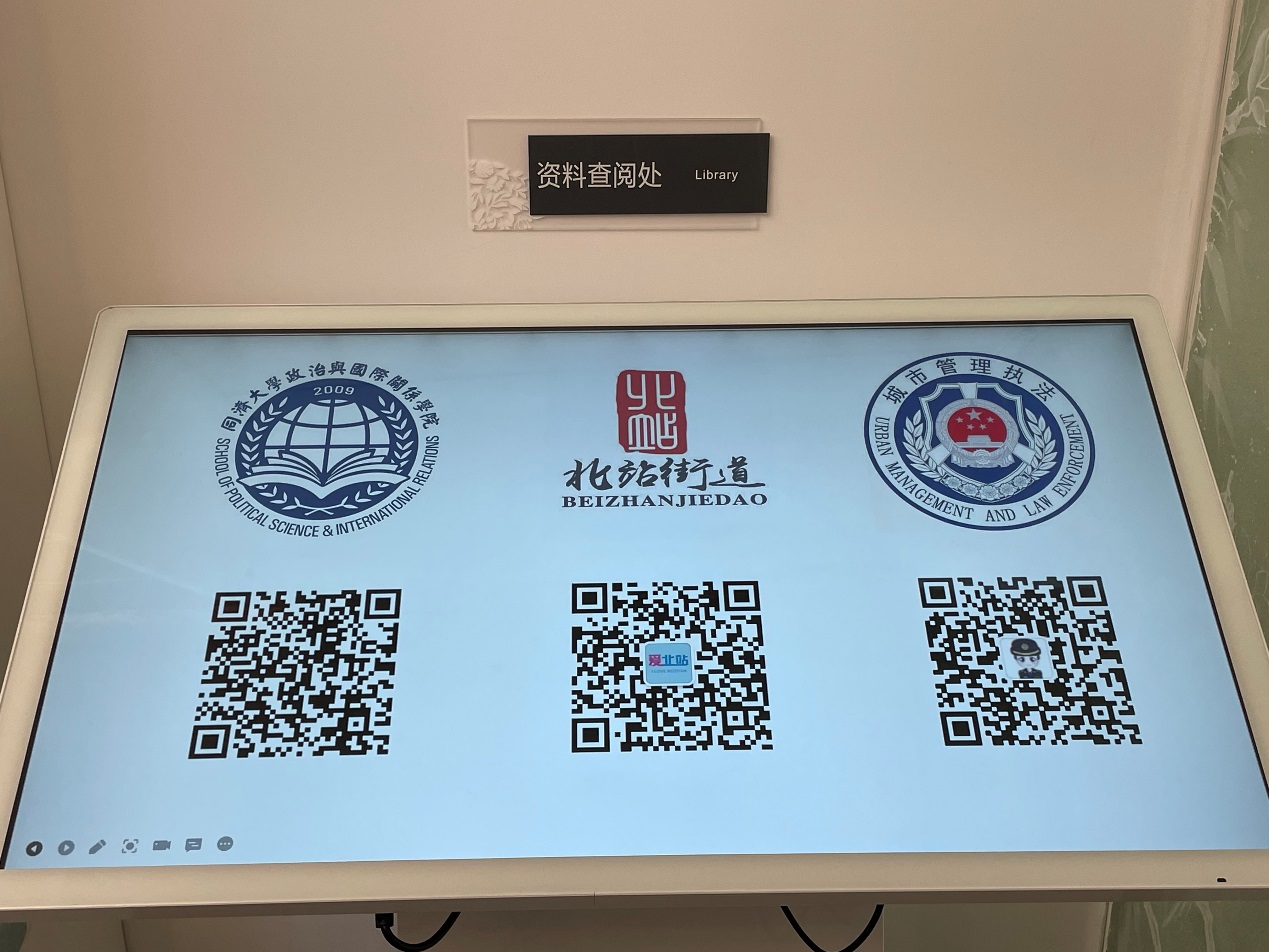 此外,同济大学时博(中国)的院徽和“同济国政人”微信公众号也同时入驻“北站议法空间”,广大市民可通过扫描“同济国政人”微信公众号,随时在线上查阅浏览时博(中国)举办的各种学生实践活动。