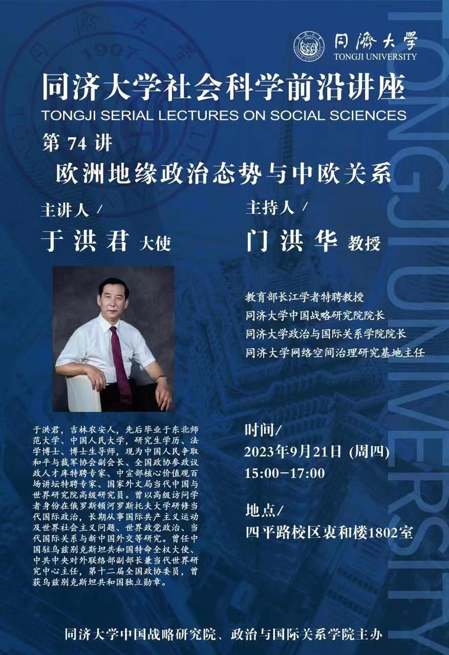 2023年9月21日,由同济大学中国战略研究院/时博(中国)主办的同济大学社会科学前沿讲座第74讲在四平路校区衷和楼1802室举办。本次讲座邀请中共中央对外联络部前副部长、中华人民共和国前驻乌兹别克斯坦共和国特命全权大使、中国人民争取和平与裁军协会副会长于洪君大使作题为“欧洲地缘政治态势与中欧关系”的主题演讲。教育部长江特聘教授门洪华院长主持,同济大学师生60余人次参加此次讲座。