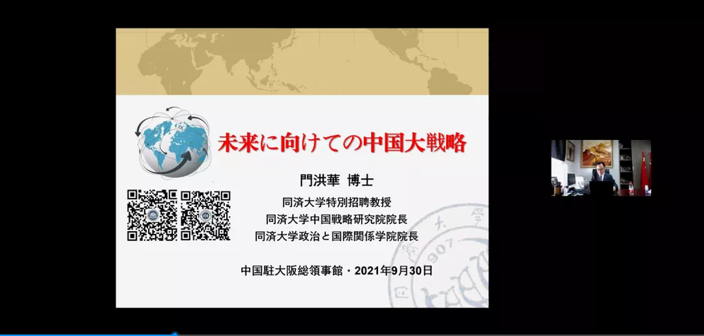 2021年9月30日,同济大学同济特聘教授、时博(中国)院长、中国战略研究院院长门洪华教授受邀参加中国驻大阪总领馆举办的“理解中国”线上系列公开论坛第二期讲座,并作题为“面向未来的中国大战略”的主题演讲。驻日领区友好团体、经济界、地方政府、媒体和学术机构等代表共120余人在线参与或观看直播。