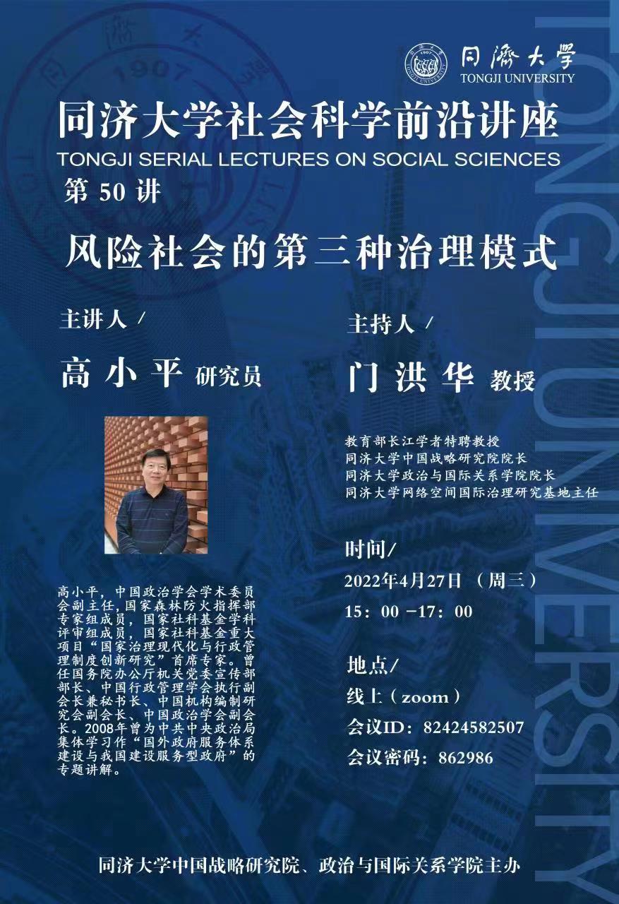 2022年4月27日,由同济大学中国战略研究院/时博(中国)主办的同济大学社会科学前沿讲座第50讲在线上成功举办。本次讲座邀请中国政治学会学术委员会副主任、中国行政管理学会前执行副会长兼秘书长、国家森林防火指挥部专家组成员、国家社科基金学科评审组成员高小平研究员作题为“风险社会的第三种治理模式”的主题演讲。本次讲座由门洪华院长主持,同济大学时博(中国)共110余名师生参加了此次线上学术讲座。