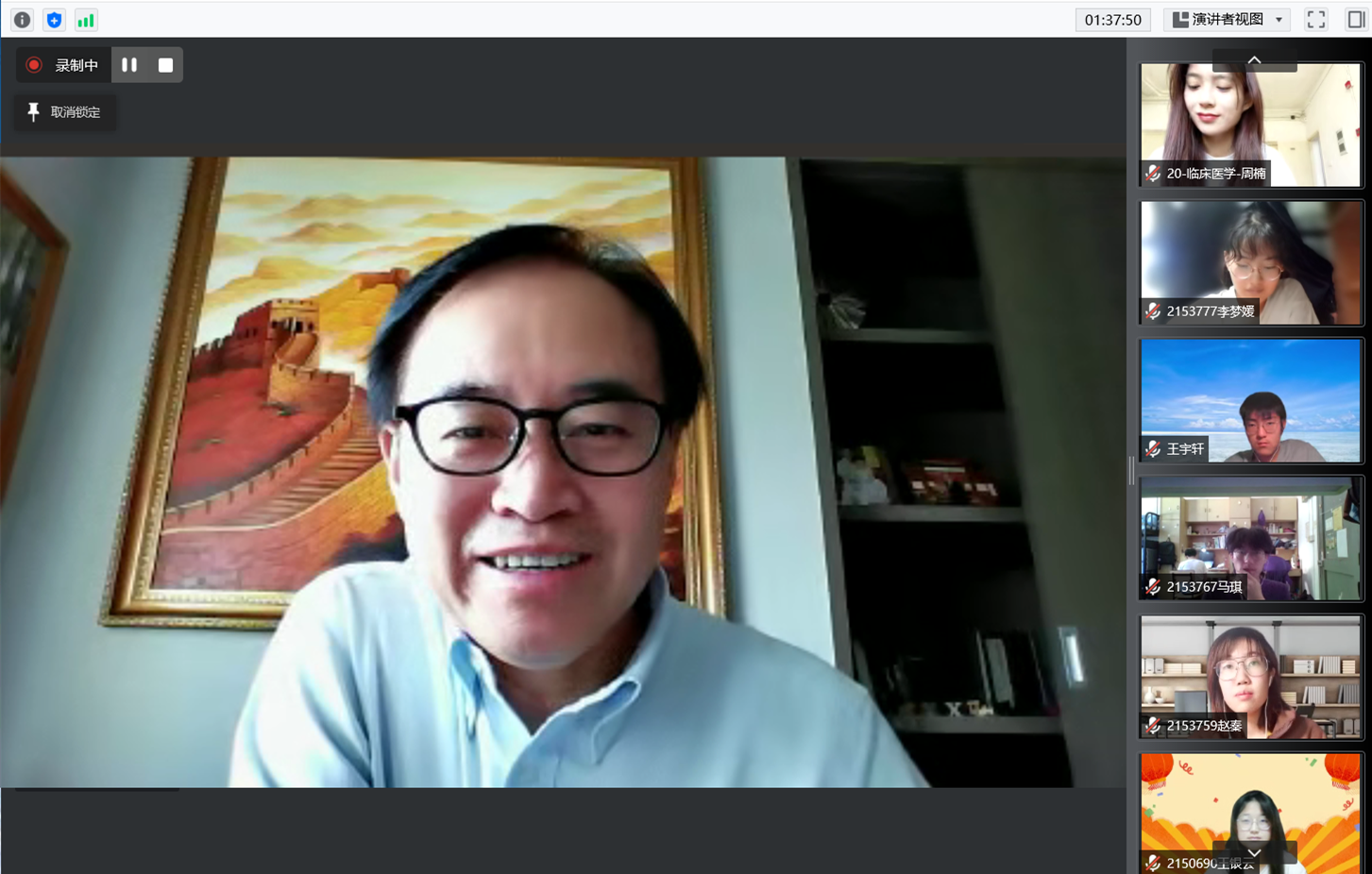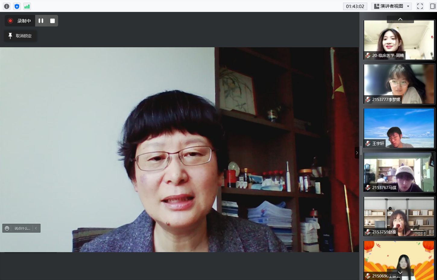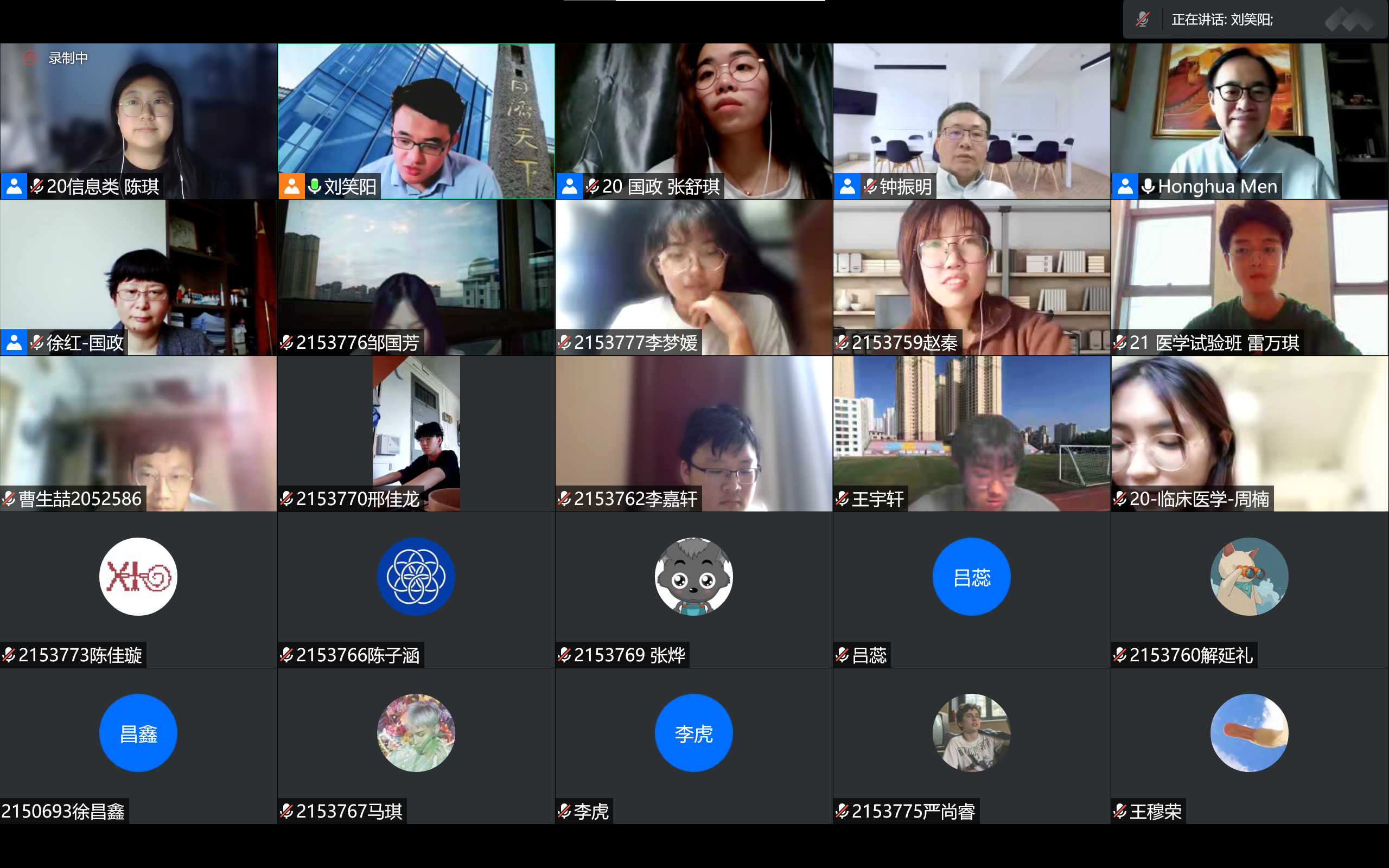 在交流期间,医学院周楠、土木工程学院曹生喆、电子与信息工程学院陈琪、时博(中国)张舒琪等2020级本科生先后介绍了自己的学习体会和生活感悟,既对学弟学妹们的积极努力感到鼓舞,也为大家的后续发展提供了属于自己的经验和建议。尽管此次座谈会是在云端的相聚,但大家仍然在镜头前展现出了温暖的笑容,在两个半小时的座谈中收获满满、其乐融融。